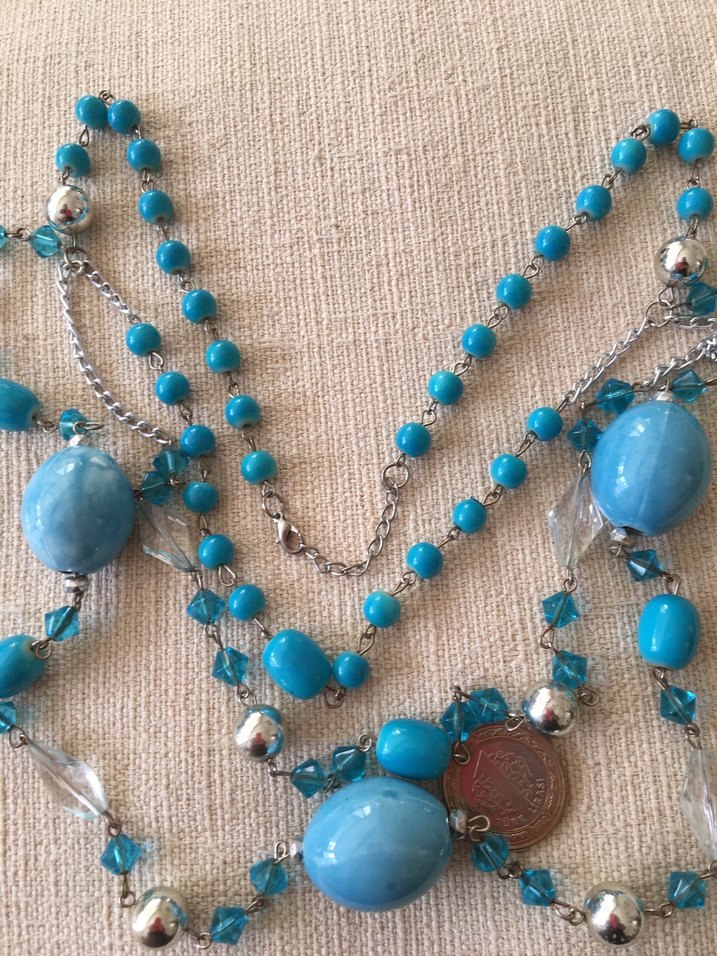 Uzun turkuaz boncuklar ve işlemeli desenle renkli bohem tarzını yansıtan kolye, günlük kullanım için uygundur. Porselen cam 100 cm