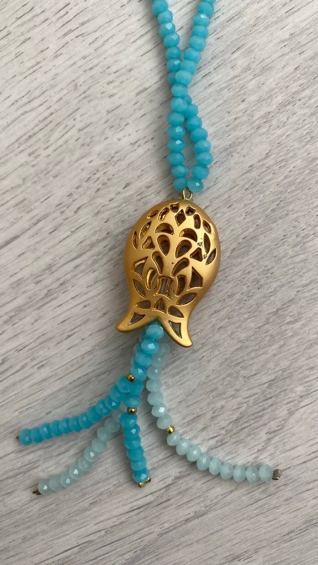 Uzun turkuaz boncuklu, işleme desenli ve altın renkli kolye, gündelik bohem tarz için uygundur.