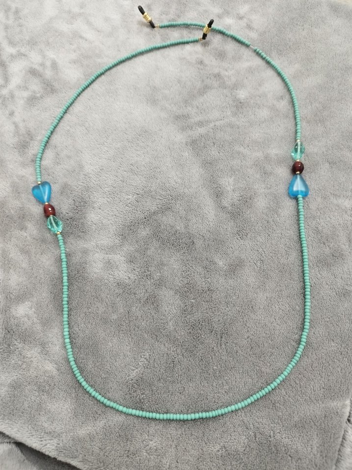 Uzun turkuaz renkte, küçük boncuklar ve kalp şeklinde detaylar içeren bohem tarzda kolye. Renkli ve bağlama desenli, günlük kullanıma uygun.