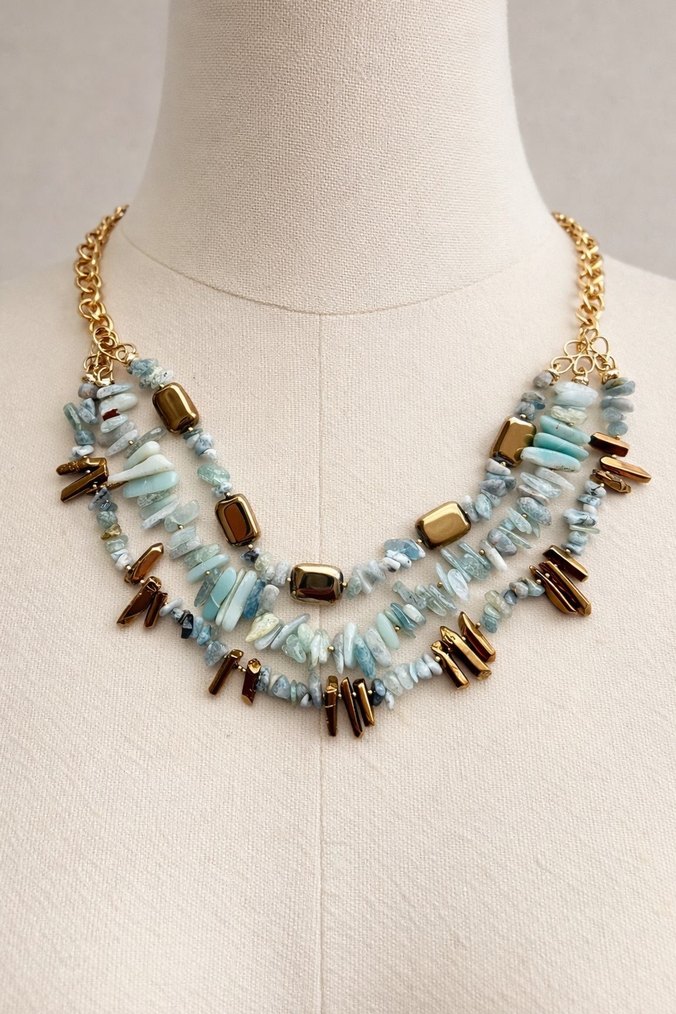 Uzun turkuaz boncuklar ve altın tonlu detaylarla desenli, bohem tarzda günlük kullanıma uygun kolye.