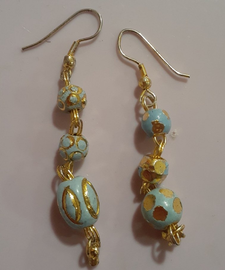 Altın detaylı desenli boncuklarla süslenmiş uzun turkuaz küpeler, bohem stil ve romantik akşamlar için uygun.