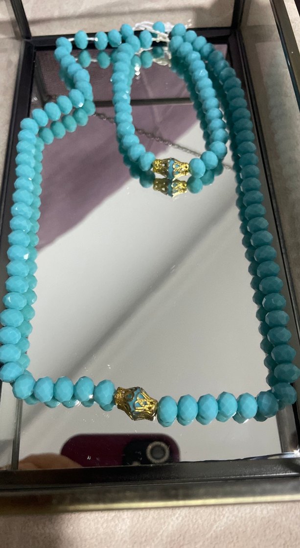 Uzun turkuaz boncuklardan oluşan, desenli bohem tarzda kadın kolye, günlük kullanım için uygundur. Kendim yapıp satıyorum isteğe göre renk yapılır