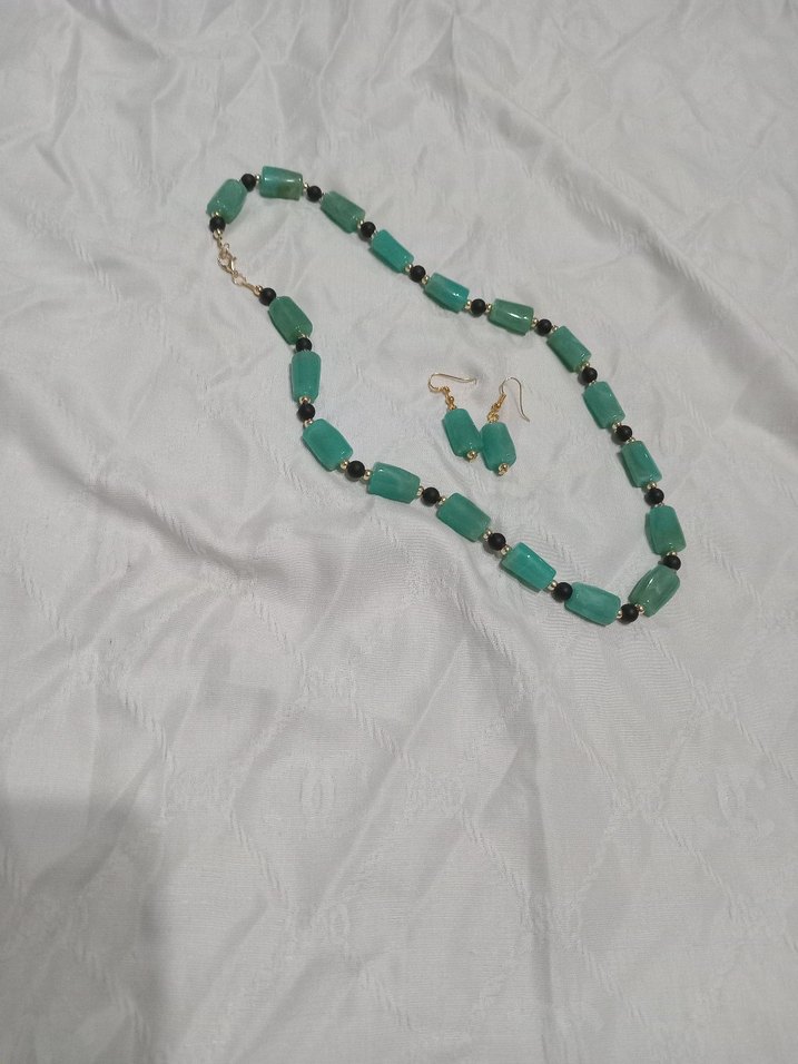 Bohem tarzda, uzun turkuaz boncuklar ve küçük koyu boncuklardan oluşan kadın kolye ve küpe seti. Minimalist ve desensiz, günlük kullanım için uygundur.