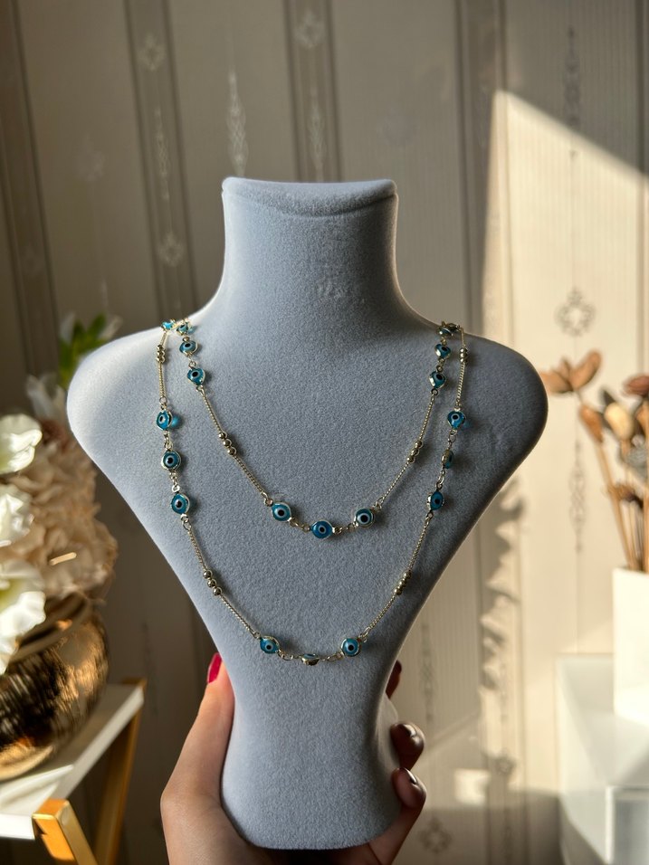 Uzun uzunlukta, turkuaz boncuklar ve nakış detaylarıyla minimalist bohem tarzda günlük kullanıma uygun kolye.