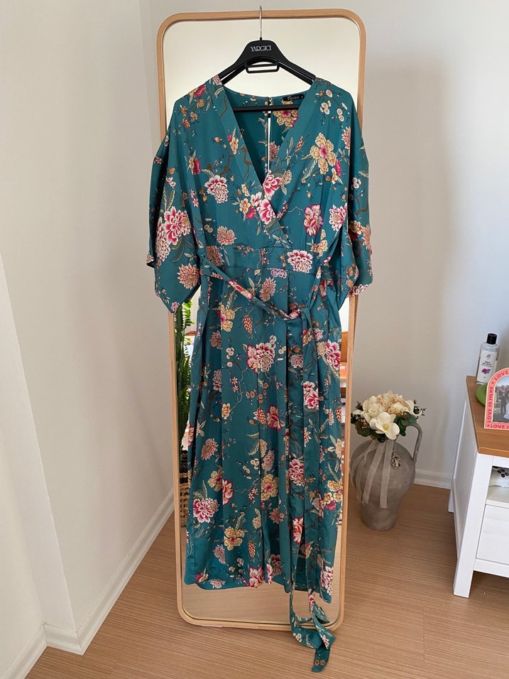 Uzun turkuaz renkli, çiçek desenli, bol kesim ve dökümlü kumaştan yapılmış bohem tarzda kadın tulum. Dökümlü uzun kollu ve V yakalıdır.