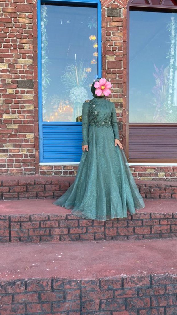 Uzun Turkuaz Çiçekli Drapeli Tesettür Abiye