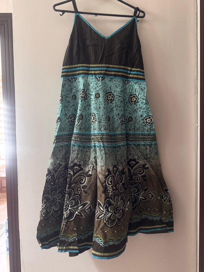 Bohem tarzda, bol kesim, drapeli uzun hamile eteği. Koyu turkuaz desenli tekstil kumaştan, günlük kullanıma uygun.