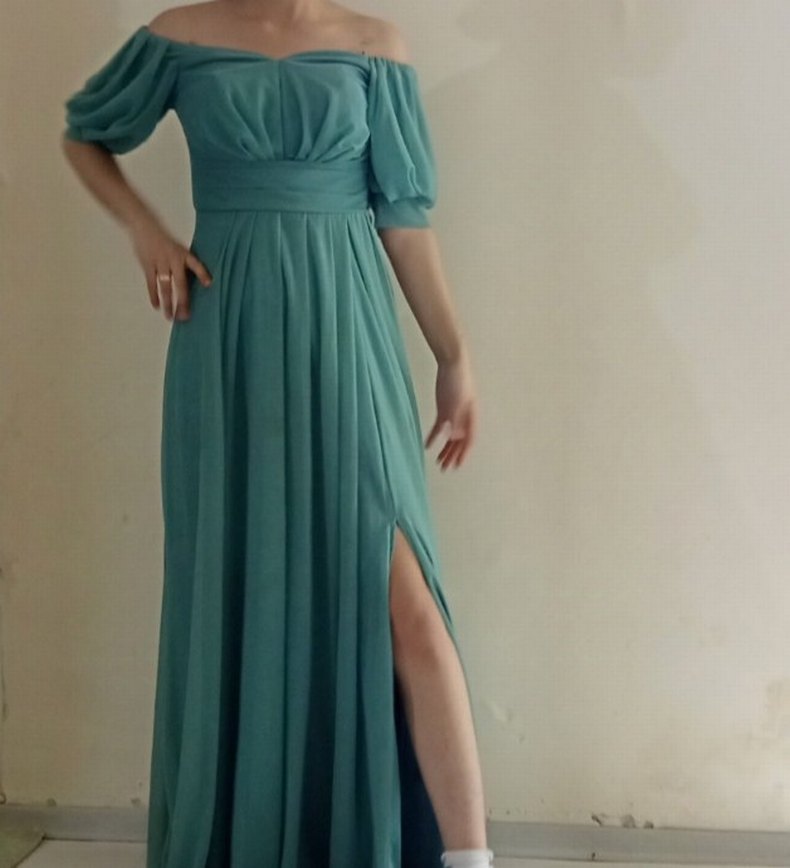 Uzun turkuaz drapeli abiye elbise, straplez yakalı ve askılı kollu. Salaş kesimi ve yan yırtmaç detayıyla düğünlere uygun.