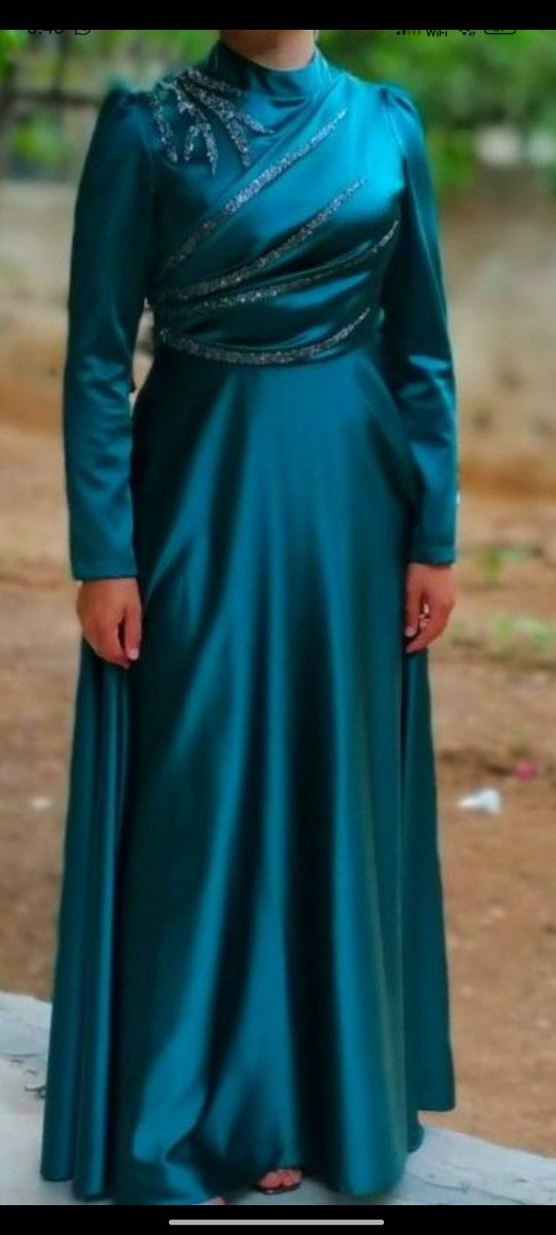 Bu uzun, dar kesim abiye elbise, tekne yaka ve uzun kollu olup, parlak turkuaz kumaşta drapeli tasarıma sahiptir.