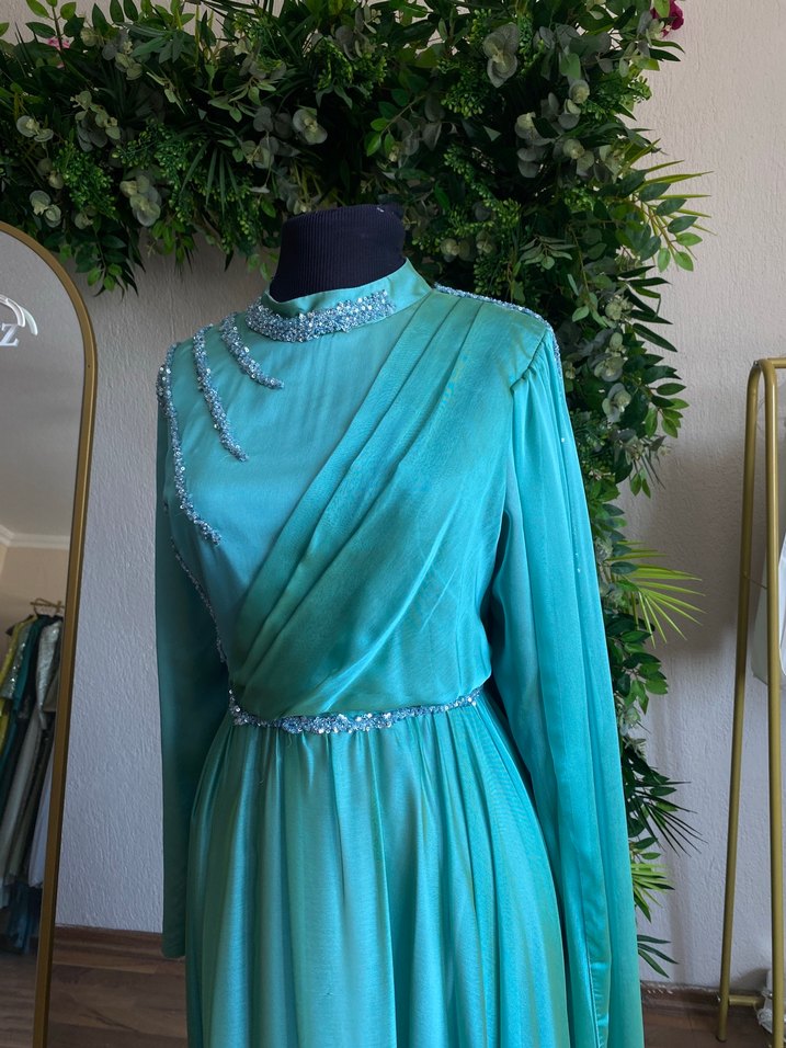 Uzun turkuaz renkte, drapeli ve yüksek yakalı abiye elbise. Uzun kollu, parlak kumaş ve klasik şıklık sunar. Düğünler için uygun, desen içermeyen model.