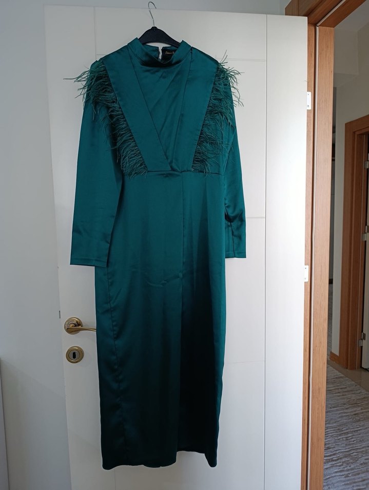 Uzun, dar kesim turkuaz gece elbisesi, drapeli detaylar ve uzun kollara sahip, gotik ve avangard tarzlar için uygun.