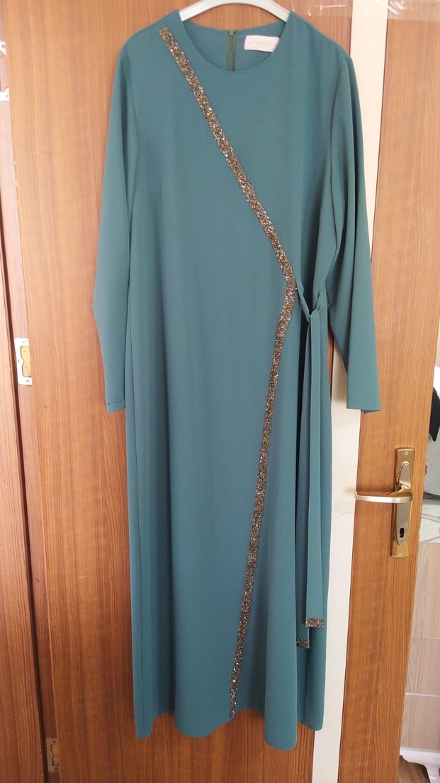 Uzun turkuaz renkli, drapeli ve bol kesim kadın elbisesi. Notlu yaka ve ince askılı, parlak dokusu ile ofis için uygun minimal tarzda.