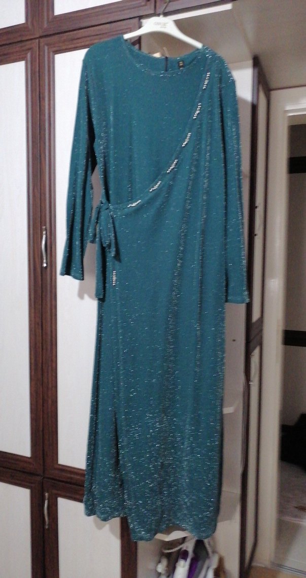 Turkuaz uzun elbise, drapeli tasarımı ve bol kesimiyle ön plana çıkar. Uzun kollu yuvarlak yakalı ve yumuşak prıltılı kumaştan üretilmiştir. Parti için uygun dügün nişan kına kendinden astarlı içi göstermez bohem avant-garde tarzda.42 44 beden arası etiketlidir bana böyük oldugu için satıyorum markası Nazra