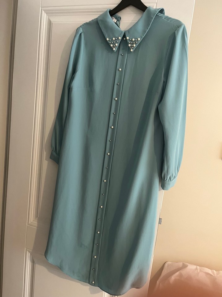 İnci düğmeli yakası ve uzun kollu tasarımıyla, parlak ve ipeksi kumaştan uzun turkuaz tunik, modern klasik ofis stiline uygundur.