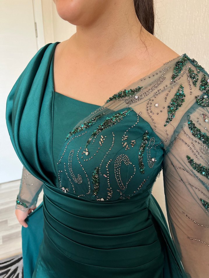 Parlak zümrüt yeşil renkli, uzun ve vücuda oturan bu abiye elbise, kayık yaka ve drapeli detaylara sahiptir. Uzun kollu ve işlemelidir, düğün için uygundur. ✨170 boy 68 kiloda giyildi. Yırtmacta işlem mevcuttur dekoltede kapatma yapılmıştır