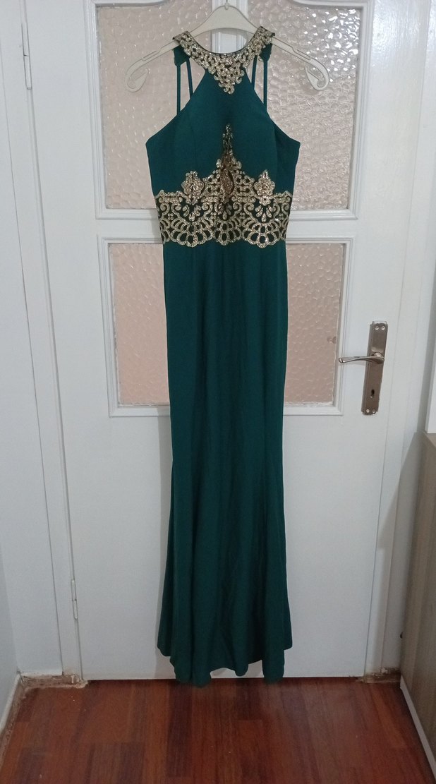Uzun, fit kesim turkuaz abiye elbise, straplez yaka ve işlemeli detaylarla süslenmiş, drapeli bel kısmı ile şık ve göz alıcıdır.
