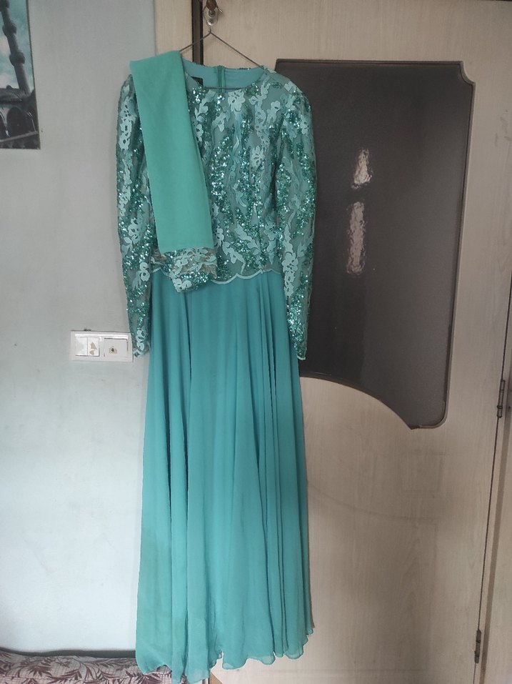 Uzun turkuaz renkte, bol kesimli, drapeli ve uzun kollu kadın abiye elbiseYuvarlak yaka ve desensiz, klasik ve gösterişli bir tarz sunar.