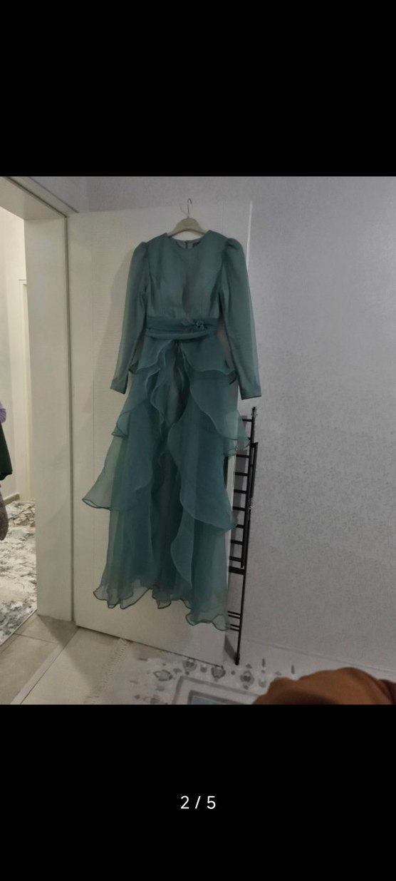 Uzun kollu, yüksek yakalı ve oturmalı turkuaz abiye elbise. Vintage tarzda kat kat fırfırlı detaylara sahip, düğünler için uygun.