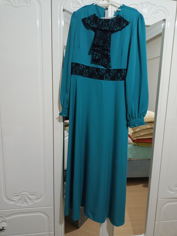 Uzun turkuaz renkte, drapeli ve uzun kollu kadın elbisesi. Sentetik kumaştan, yuvarlak yaka ve siyah dantel detayları ile ofise uygun.cok şık bir elbise dökümlü kumaş defosuz
