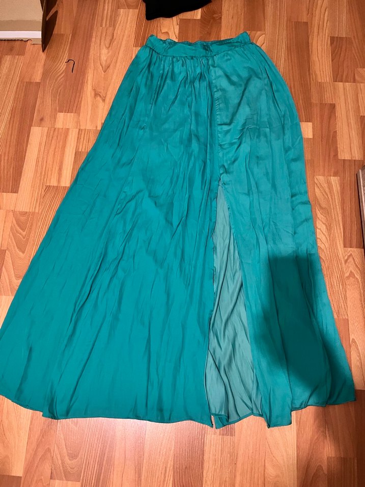 Yumuşak, ipeksi kumaştan yapılmış, drapeli ve bol kesimli uzun turkuaz etek. Parlak yüzeyi ve bohem tarzı parti için uygundur.