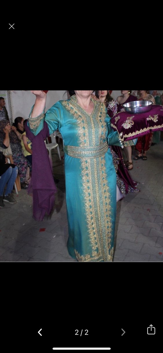 Uzun turkuaz renkli, bol kesim ve drapeli, etnik desenli Hint elbisesi. Parlak kumaş, V yakalı ve uzun kolludur, mütevazı düğünler için uygundur.