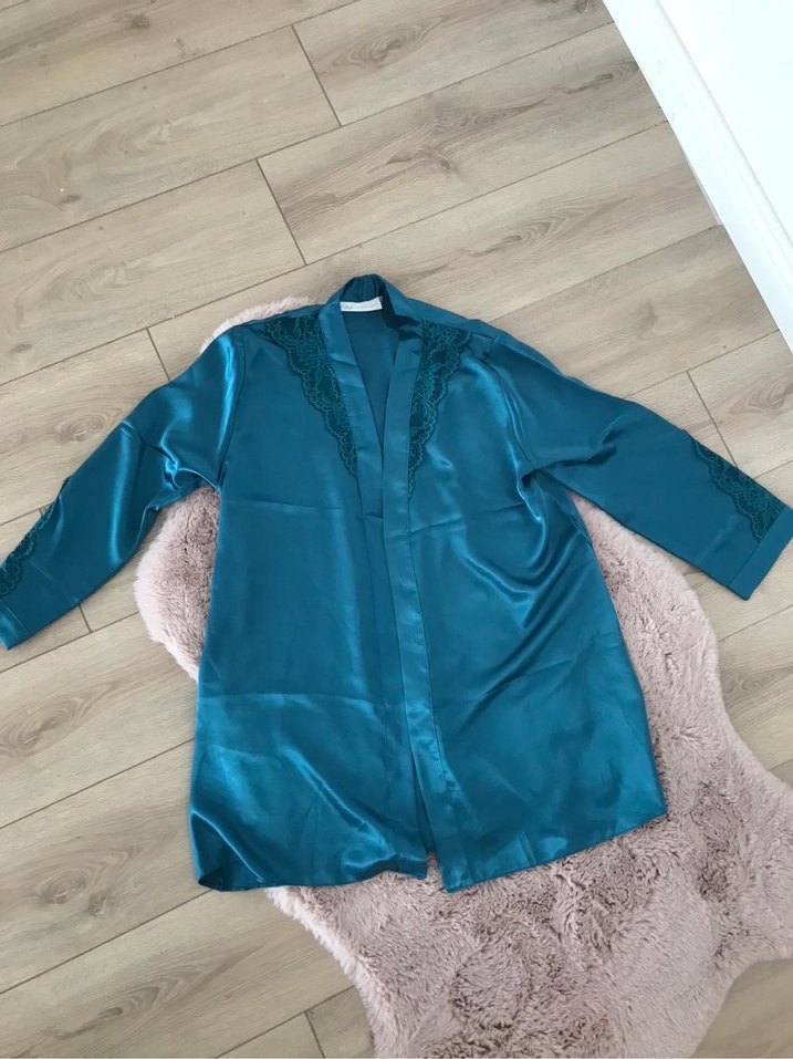 Uzun ve bol kesim kadın sabahlık, parlak turkuaz kumaş ve uzun kollu, bohem dantel detaylarıyla rahat ve şık bir görünüm sunar.