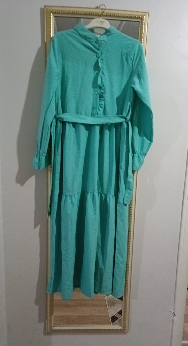 Yumuşak keten kumaştan yapılmış, yüksek yakalı ve kemerli uzun turkuaz elbise. Salaş ve bohem tarzda, askılı kollu ve desensiz tasarım. Günlük kullanım için uygun.