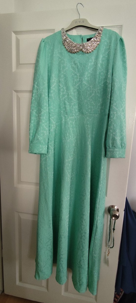bel çevresi 91cm Uzun turkuaz elbise, uzun kollu ve yuvarlak yakalıdır. Yumuşak keten kumaştan, bol kesimdir ve hafif vintage dokusuyla düğün için uygundur.