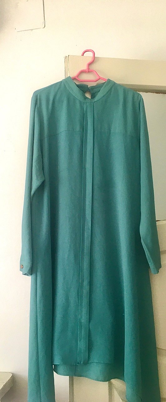 Yumuşak keten kumaştan yapılmış, uzun turkuaz renkte, bol kesim ve drapeli kadın tunik. Yüksek yakalı ve uzun kolludur, sade ofis şıklığı için uygundur.