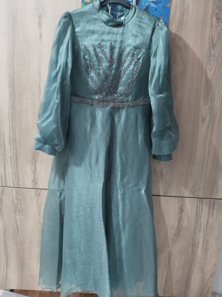 Uzun turkuaz abiye elbise, yüksek yakalı, uzun kollu ve nakışlı drapeli detaylara sahiptir. Parlak dokusu ve klasik kesimiyle düğünler için uygundur.