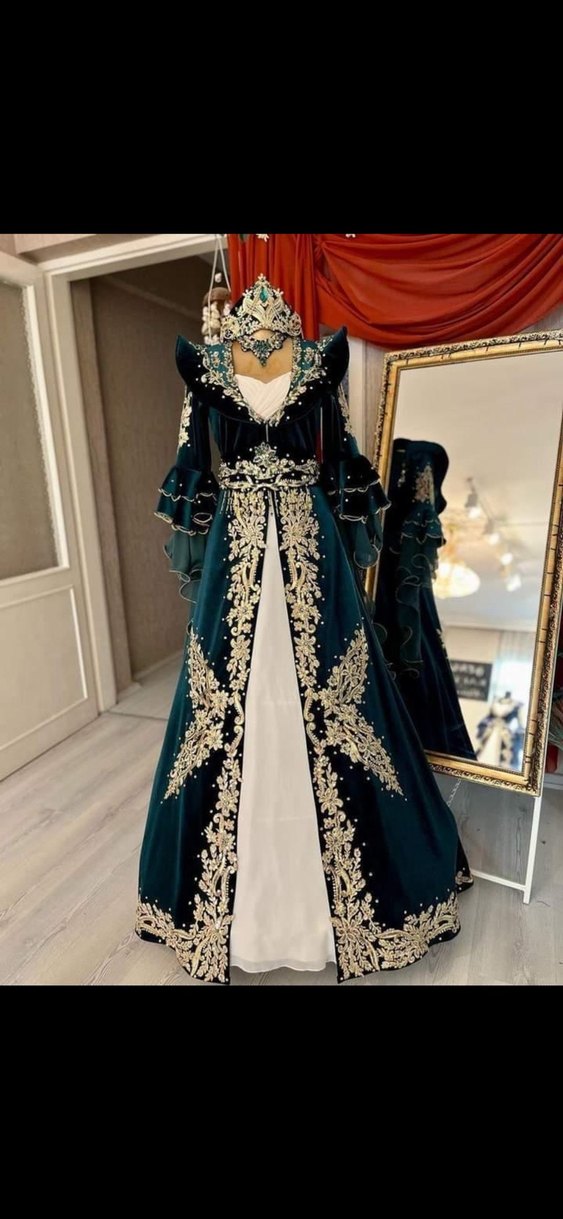Uzun, bol kesim bindallı elbise koyu turkuaz kumaş üzerinde detaylı boncuklu nakışlarla süslenmiştir. V yaka ve uzun kolludur, düğün için uygundur. Sıfır üründür içlik rengi siyahtır her şeyi takım halinde gönderilecektir