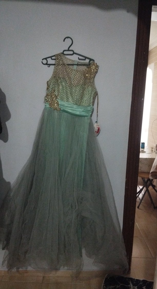 Bu uzun turkuaz abiye, straplez yakası, nakış detayları ve drapeli dar kesimi ile düğün ve özel anlar için uygundur.