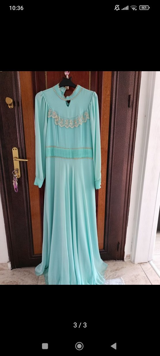 Uzun, turkuaz renkli, nakışlı, bol kesim ve drapeli vintage tarzda kadın elbisesi. Uzun kollu ve V yakalı, düğün için uygun bohem esintili model.
