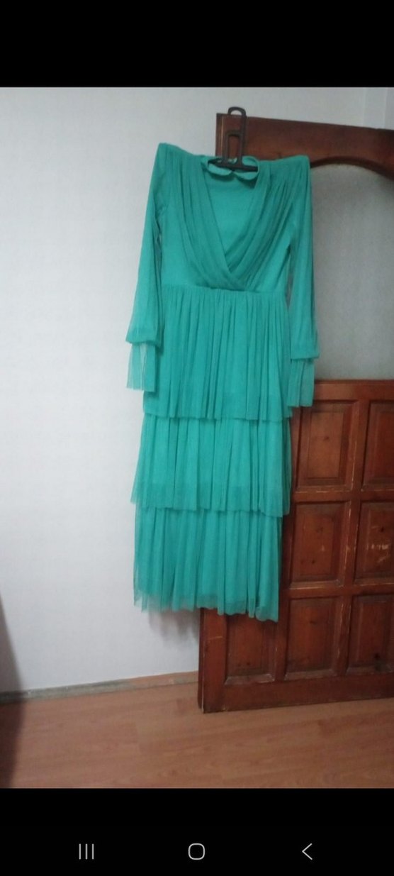 Turkuaz renkli, pilili uzun elbise, V yaka ve bol kesimlidir. Uzun kollu, bohem tarzda, parti için uygundur.