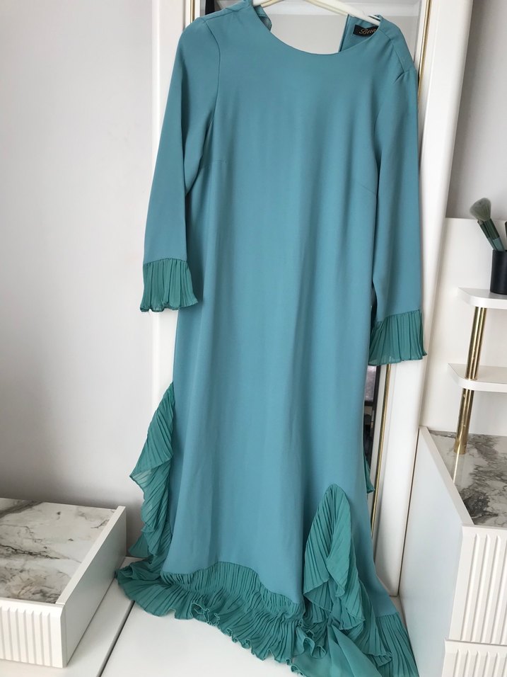 Uzun turkuaz renkli elbise, manşet ve etek uçlarında pilili detaylara sahip, yumuşak sentetik kumaştan, bol kesim ve yuvarlak yaka ve sadece 1-2 defa giyildi 36-38bedene uyumlu özel günlerde cok hoş kullanılır