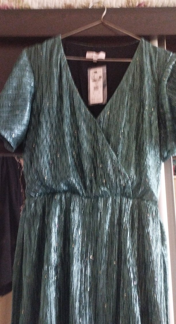Uzun, turkuaz renkli, V yaka ve pilili tasarıma sahip, bol kesim ve kısa kollu, parlak yüzeyli abiye elbise.