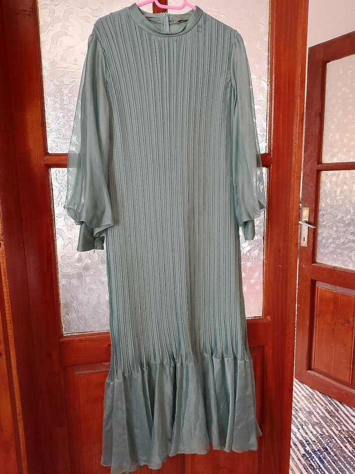 Uzun, turkuaz renkte pliseli, yüksek yakalı ve uzun kollu bol kesim elbise. Yumuşak sentetik kumaştan, vintage bohem tarzını yansıtır. 2 kere giyildi