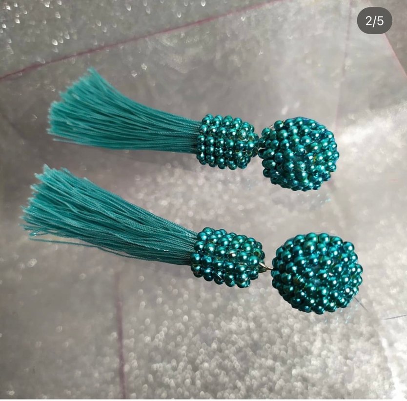 Uzun boyda, işlemeli boncuklar ve püsküllerle süslenmiş turkuaz renkli bohem tarzda küpe. ✨