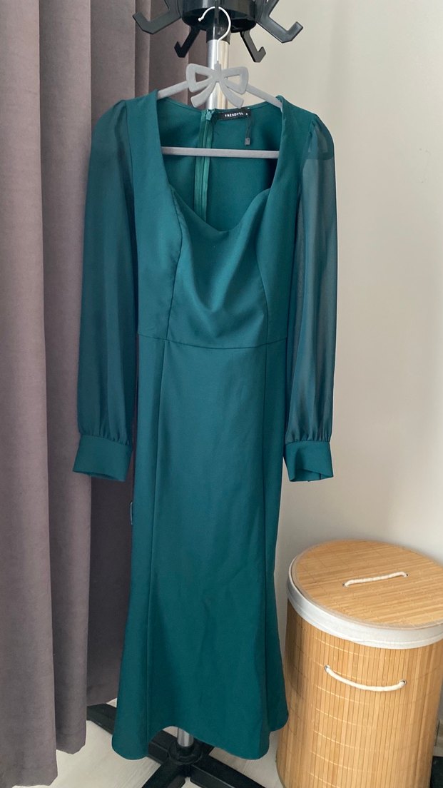 Uzun turkuaz renkli, saten görünümlü kumaştan, drapeli V yakalı ve uzun kollu, vücuda oturan modern klasik elbise.