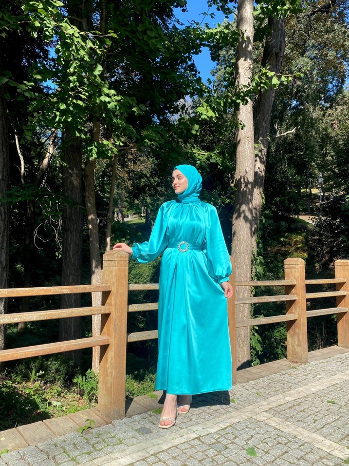 Yüksek yakalı ve uzun kollu, saten kumaştan yapılmış, bol kesimli ve drapeli uzun turkuaz elbise. Parlak dokusu ile bohem tarzı yansıtır, mütevazı günlük kullanım için uygundur. Sadece çekim için kullanıldı. Reglan kolludur. 36-38-49-42 bedenlere uyum sağlar. Şal dahildir.