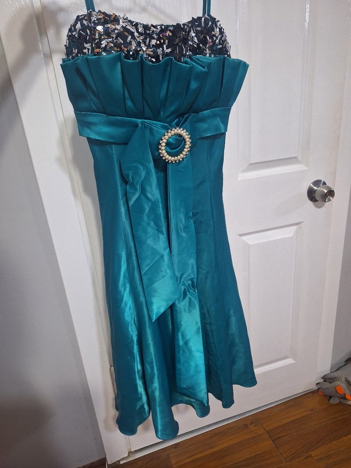 Uzun turkuaz straplez abiye elbise, bel detaylı ve inci tokalı kemer ile klasik şıklık sunar. Parlak kumaşı ve desenli üst kısmı düğün için uygundur. Askılarla beraber 95cm boy