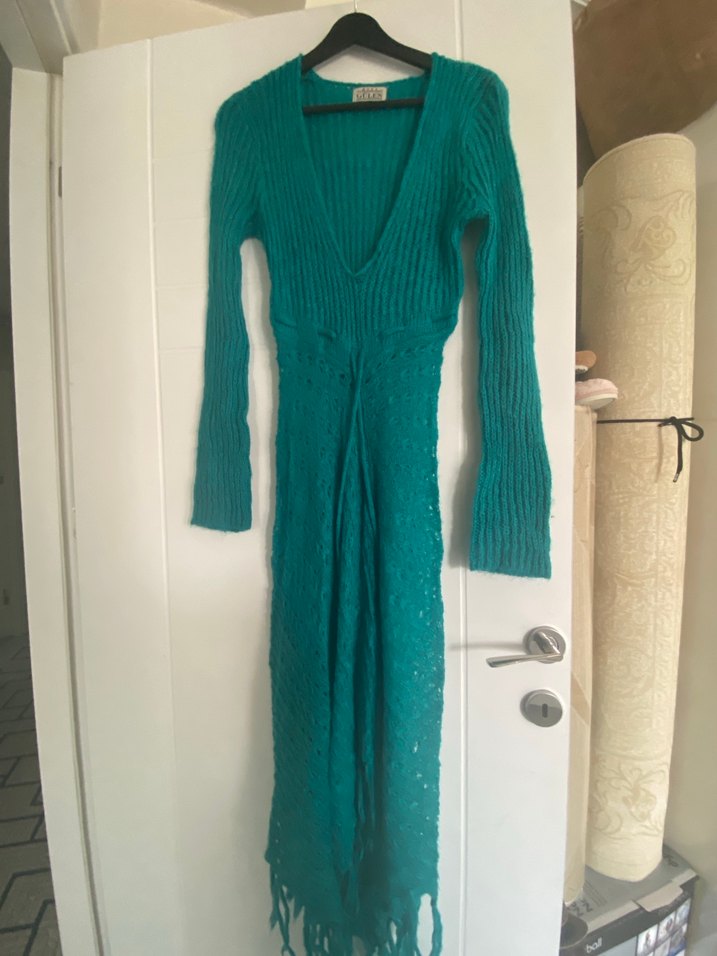Uzun boy, turkuaz renkli, uzun kollu, V yaka ve vücuda oturan örgü elbisedir. Günlük kullanıma uygun bohem tarz sunar.