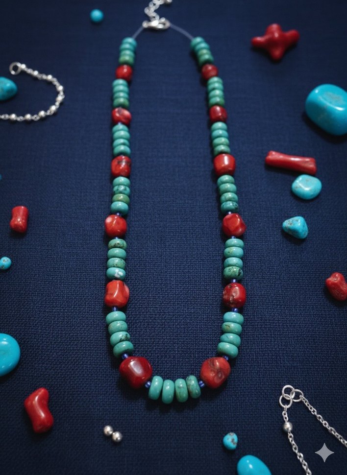 Uzun Turkuaz ve mercan Boncuklu Bohem Kolye