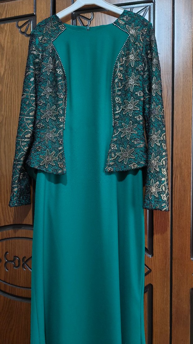 Uzun, turkuaz renkli abiye elbise, yakalı ve uzun kolludur. Parlak desenli kumaşı ve drapeli detaylarıyla vintage tarzda, düğün için uygundur.