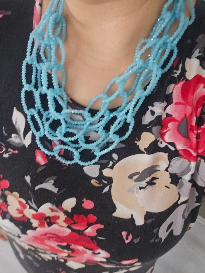 Uzun turkuaz renkte, zincir detaylı ve renkli işlemeli boncuklardan oluşan bohem tarzda kolye, düğünler için uygun.