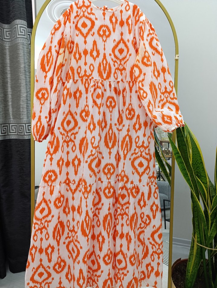 Pileli detaylı, uzun ve bol kesim turuncu renkli batik desenli elbise. Uzun kollu ve kayık yaka, yumuşak sentetik kumaştan yapılmıştır.