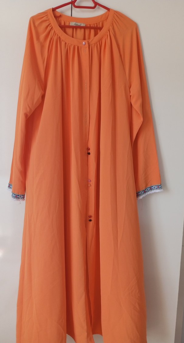 Uzun, salaş kesim kadın elbisesi, canlı turuncu renkte ve uzun kolludur. Bohem tarzda, manşetlerinde hafif desen detayları bulunur.