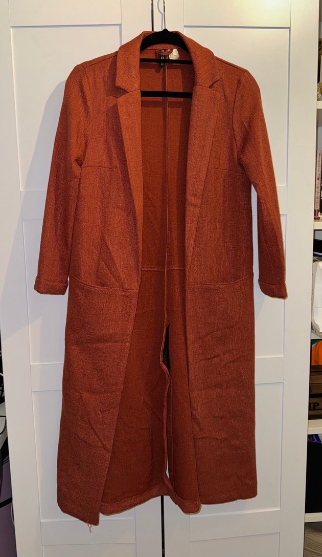 Bu uzun turuncu kaban, kesik yakalı ve düğmeli kapamalıdır. Regular fit ve uzun kolludur, minimalist sokak tarzı için uygundur. Günlük kullanıma idealdir.