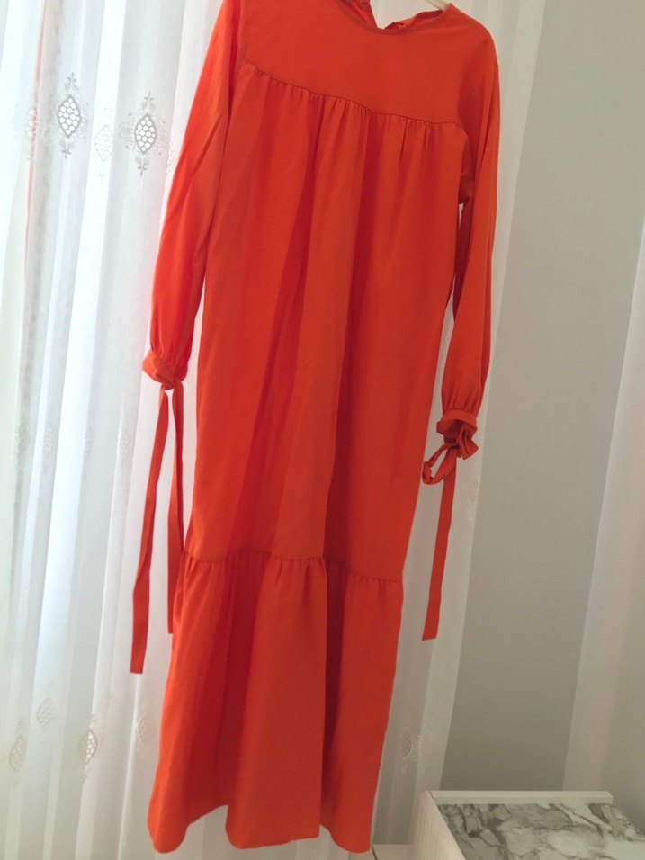 Uzun, salaş kesim, yüksek yakalı ve bağcıklı uzun kollu turuncu kadın elbisesi. Sentetik kumaştan, drapeli ve minimalist bohem tarzda. Tertemiz ve 1-2defa kullanıldı