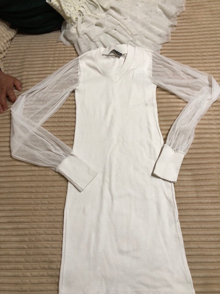 Bu beyaz triko elbise, uzun şeffaf kollara ve V yaka detaya sahip, drapeli ve minimalist sokak stili sunar. Günlük kullanıma uygundur. defosu belirtildi
